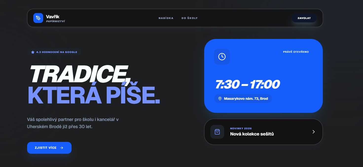 Web uděláný pro papírnictví, přehledný, čistý design